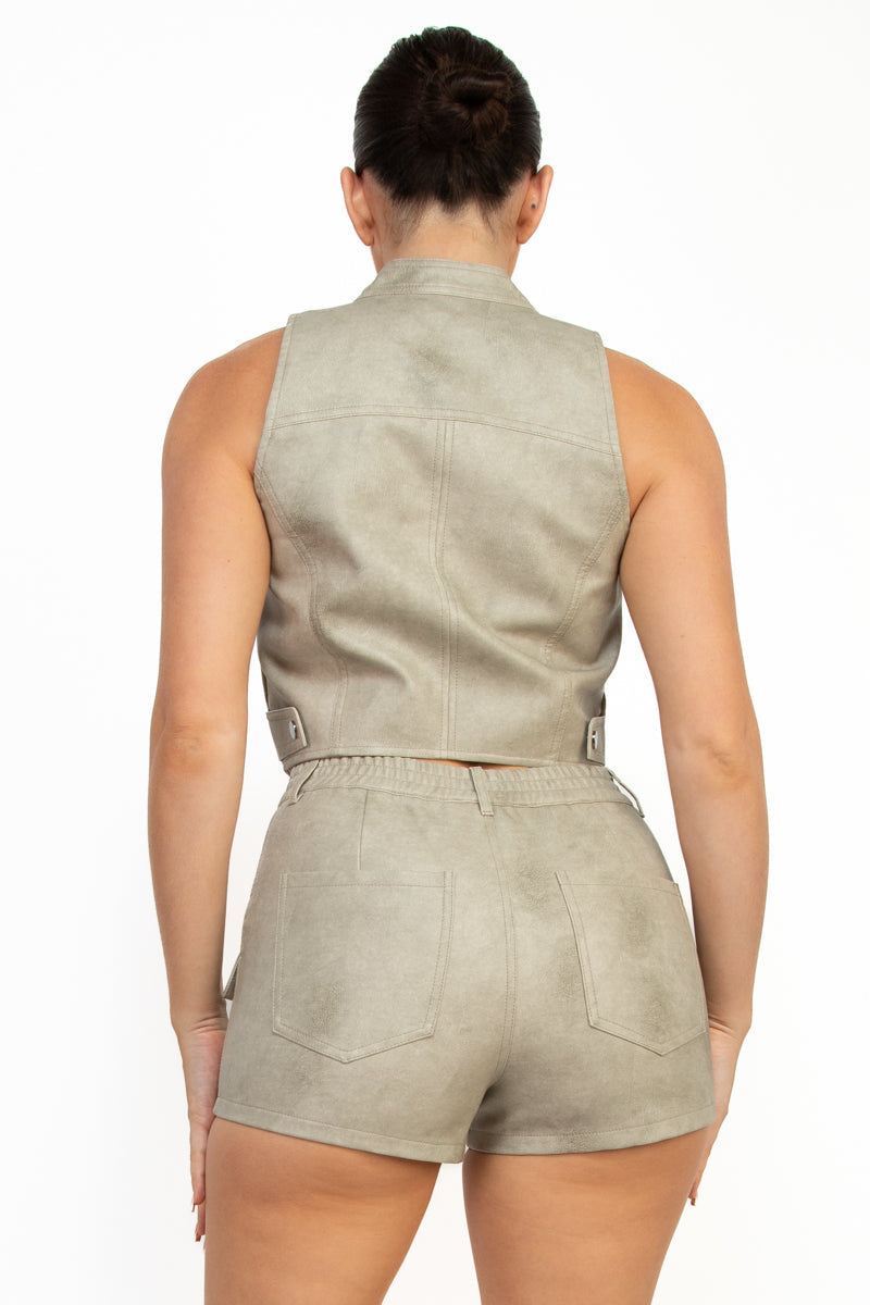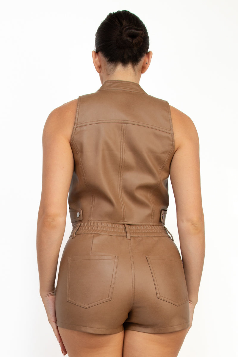 Chaleco versátil de vinipiel con cierre de cremallera y prácticos bolsillos funcionales. Confeccionado en poliéster de alta calidad, ofrece durabilidad y fácil mantenimiento. Su diseño moderno y versátil se adapta a múltiples estilos, permitiéndote crear looks sofisticados tanto para ocasiones casuales como más formales. Una pieza imprescindible que elevará tu guardarropa.