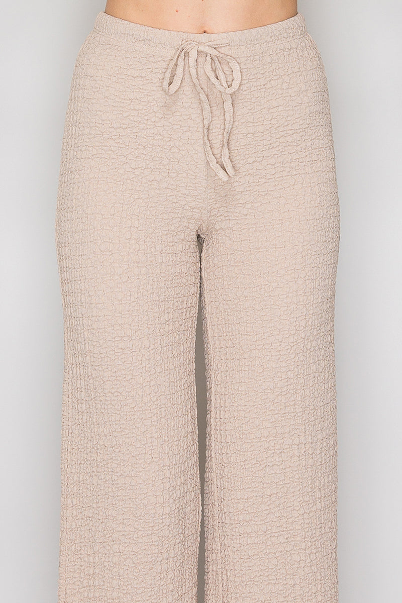 Conjunto versátil de top manga corta y pantalón con detalle de lazo texturizado. Confeccionado en poliéster y spandex para comodidad y movimiento. Ideal para un look casual elegante que transita del día a la noche. Perfecto para cualquier ocasión.