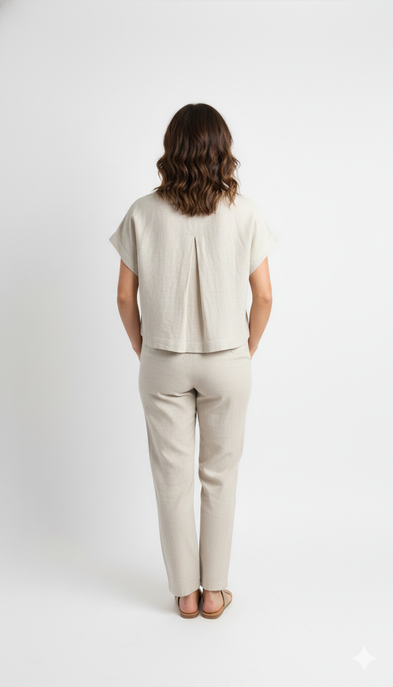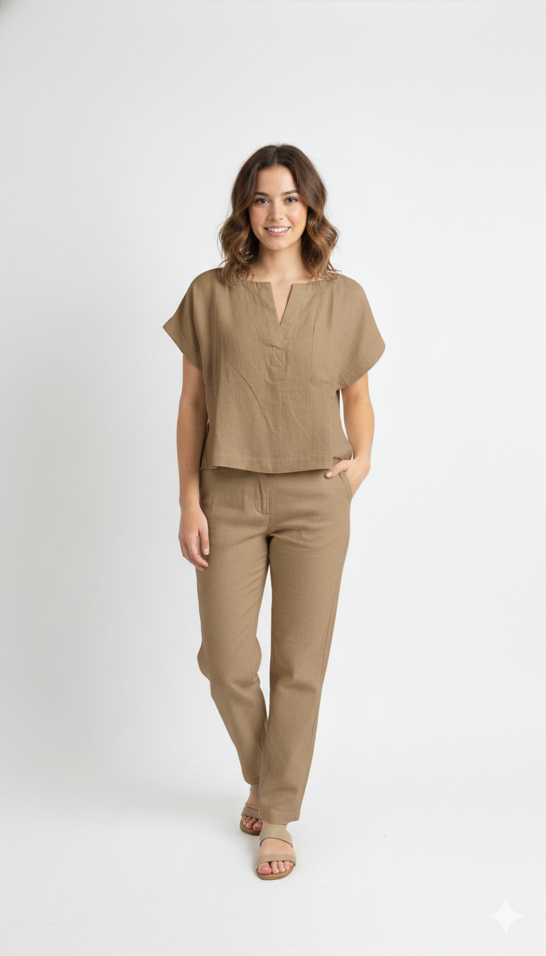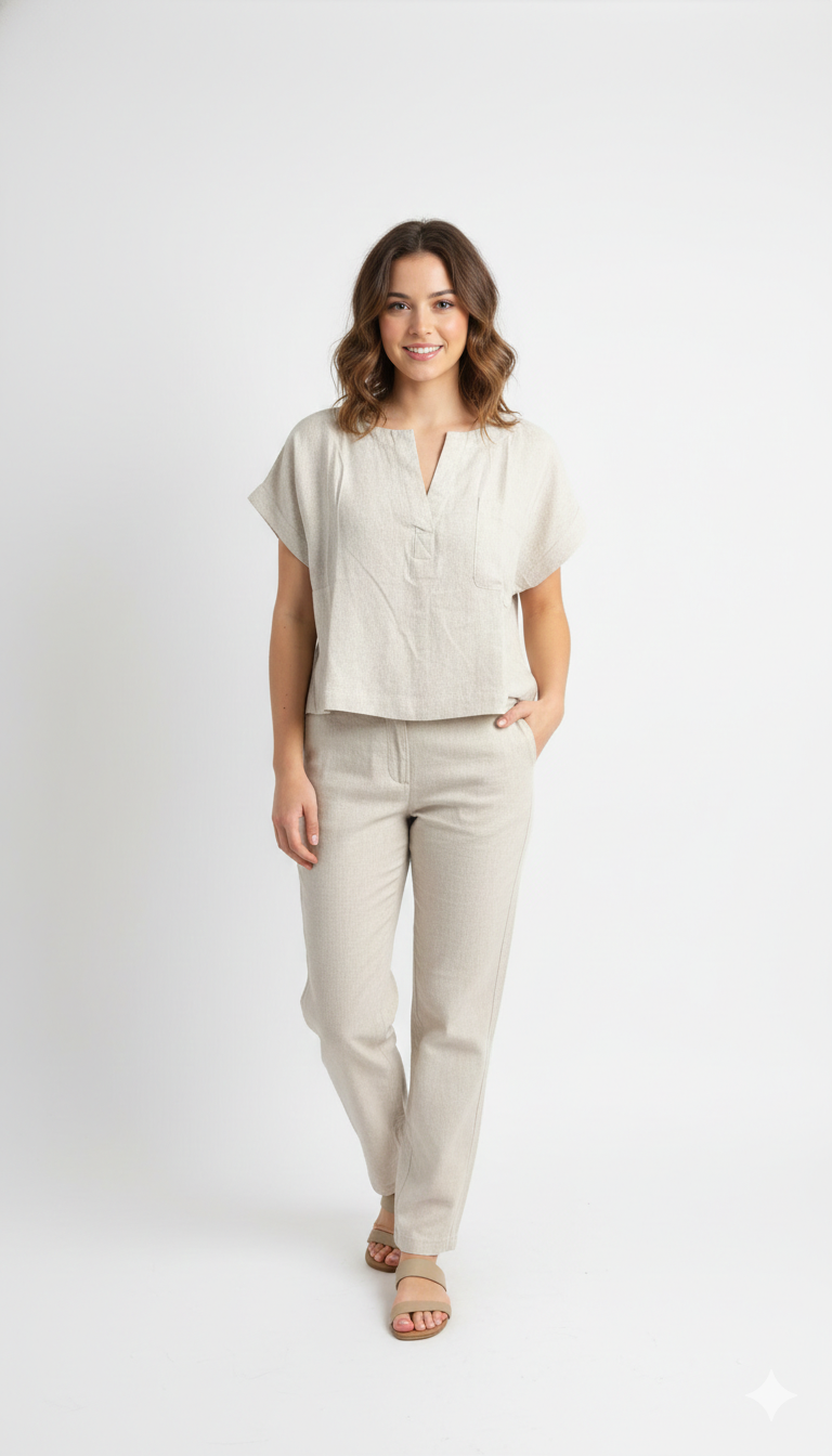 Descubre la comodidad y el estilo en una sola prenda. Este crop top combina rayon suave con lino natural en una proporción perfecta (85% rayon, 15% linen) para ofrecerte transpirabilidad y movimiento sin sacrificar elegancia. Su cuello en V favorecedor y mangas cortas lo hacen ideal para días cálidos, mientras que la composición de fibras naturales garantiza durabilidad y una caída impecable. Una pieza versátil que eleva cualquier look casual o de playa.