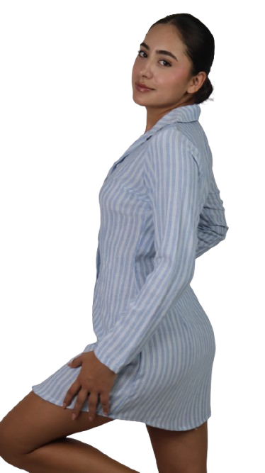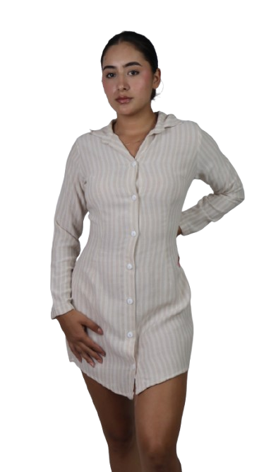 Vestido corto de manga larga con diseño de rayas, confeccionado en una mezcla cómoda de 77% rayón, 20% nylon y 3% elastano. Perfecto para un look casual con estilo y comodidad durante todo el día.