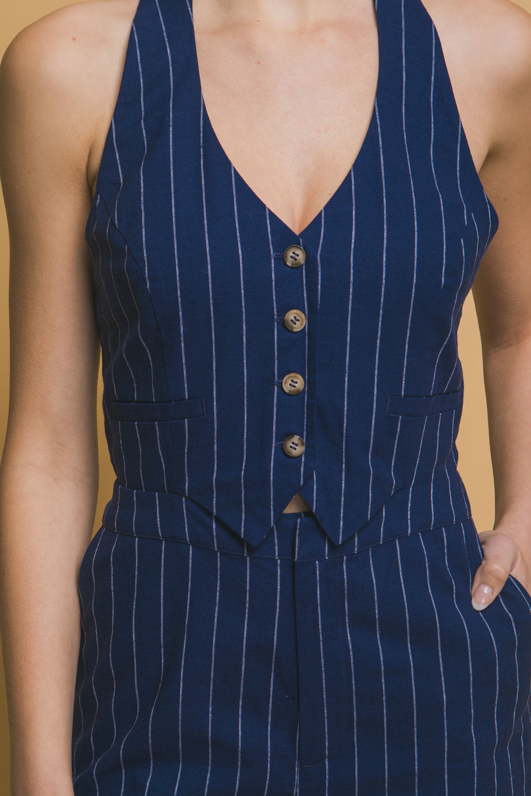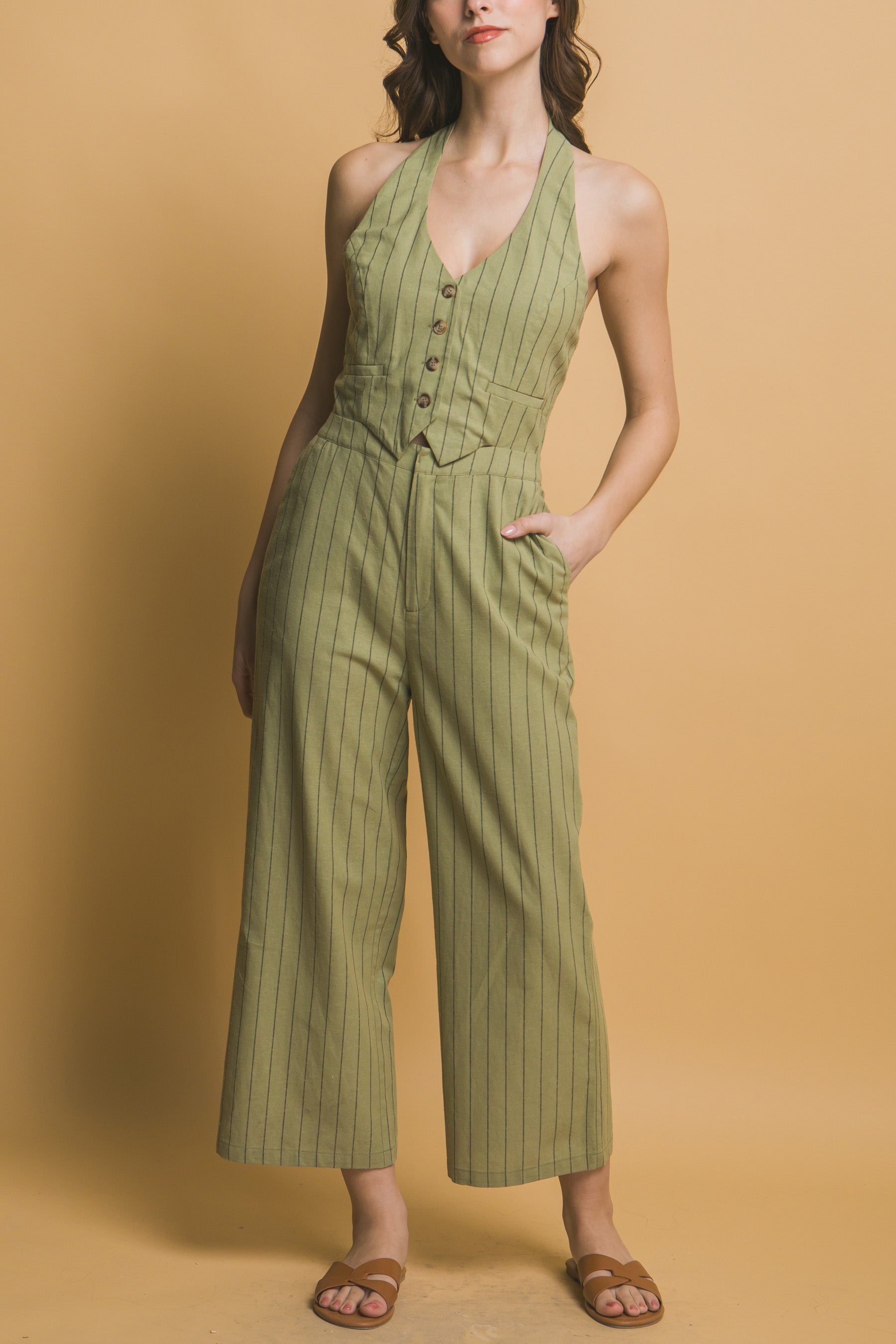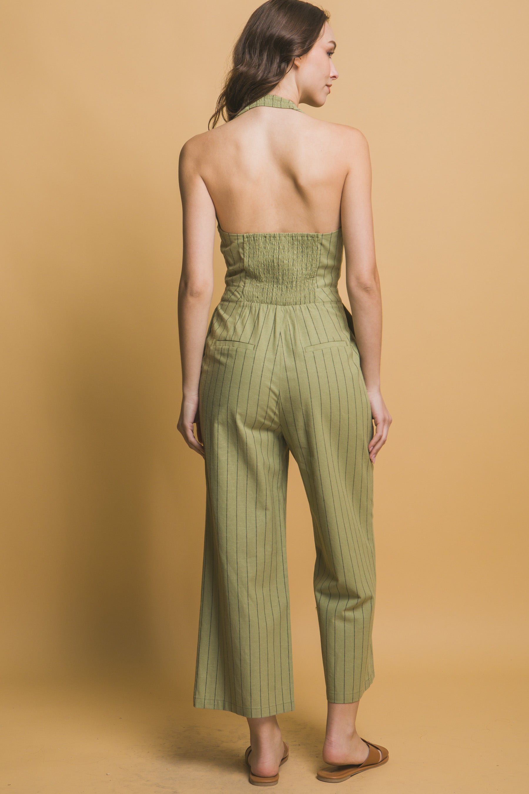 palazzo de lino con rayas con cuello halter 55% cotton 32% viscose 13% linen