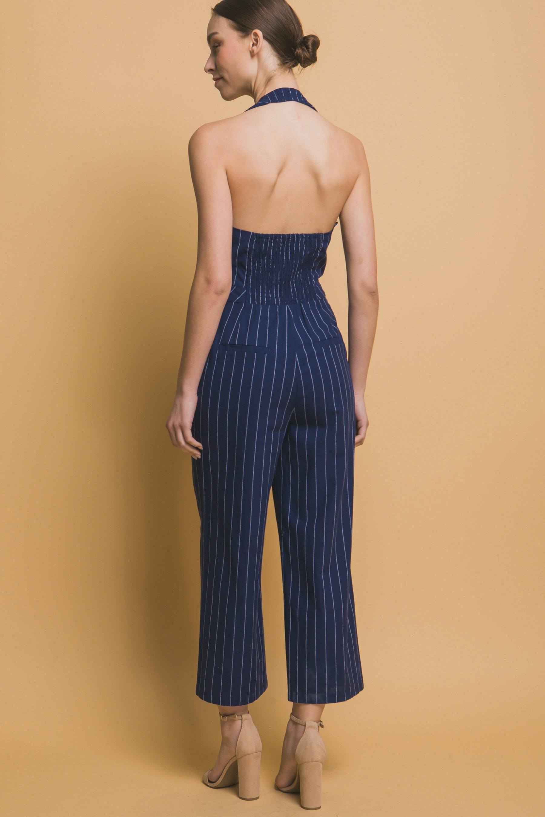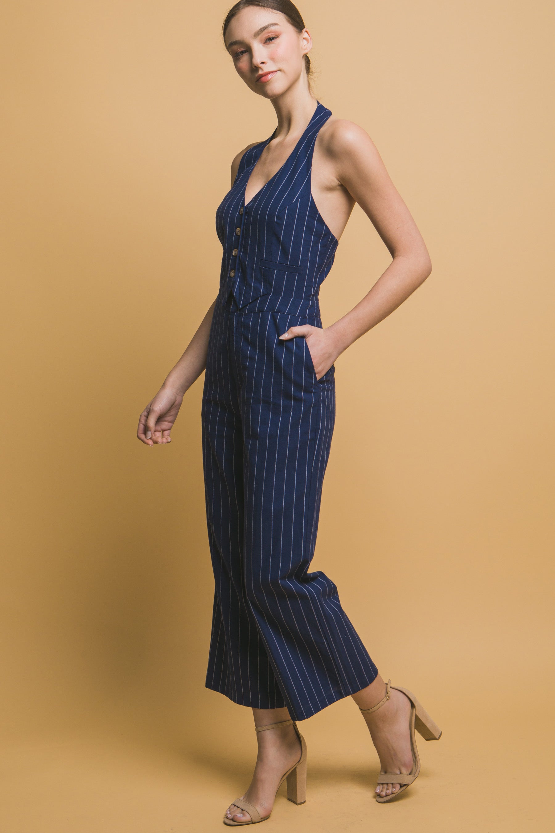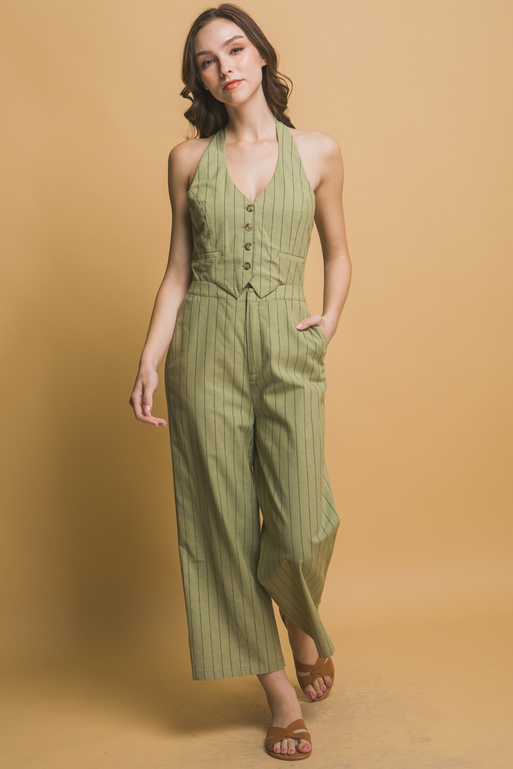 palazzo de lino con rayas con cuello halter 55% cotton 32% viscose 13% linen
